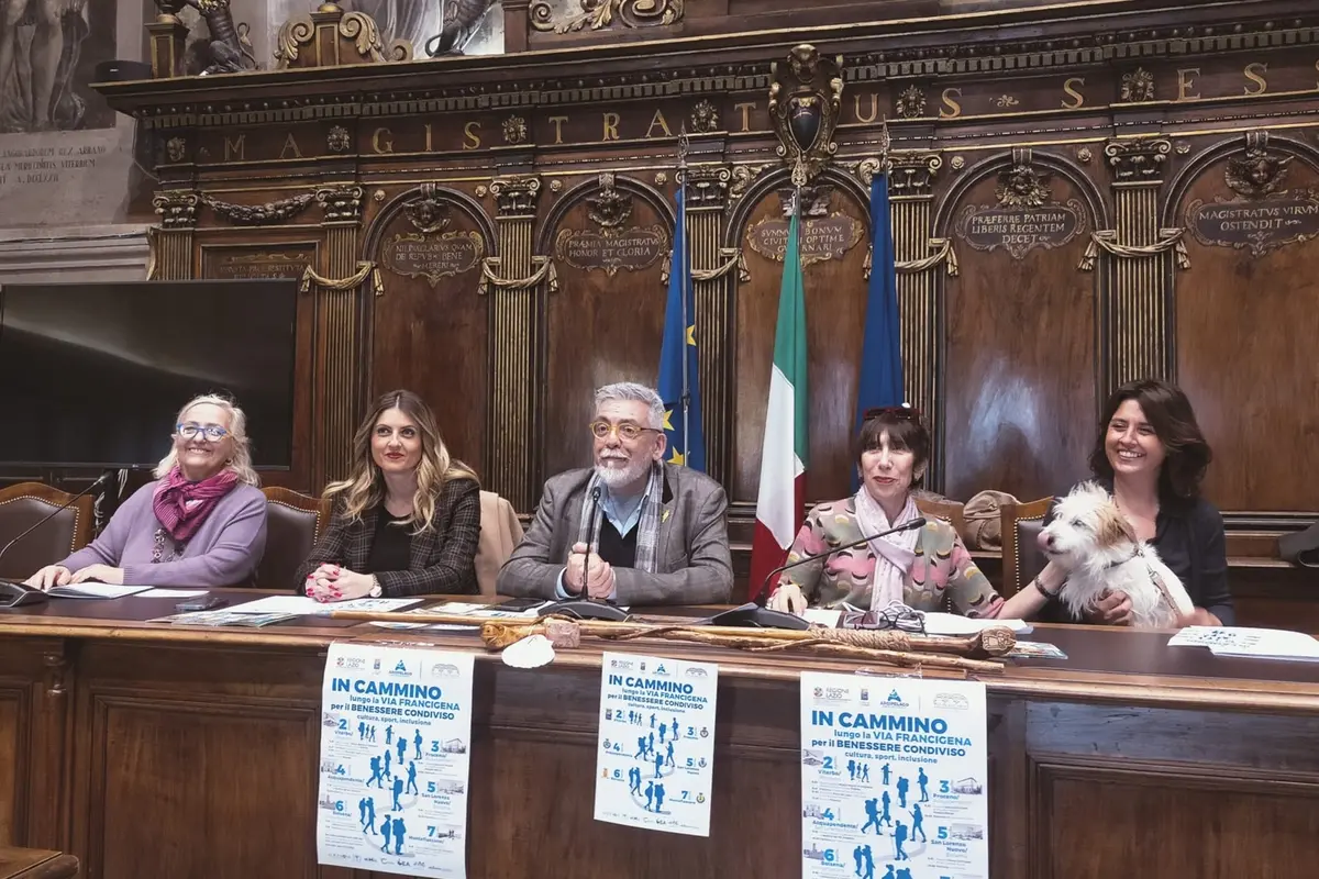 In sala d’Ercole per presentare la manifestazione, promossa da Arcipelago - centro polivalente per disturbi dello spettro autistico e altre disabilità con bisogni complessi - l’assessore alle Politiche sociali Patrizia Notaristefano, il vicesindaco e assessore alla Cultura Alfonso Antoniozzi, la consigliera delegata alla promozione della Via Francigena e al Giubileo 2025 Alessandra Croci, la consigliera - ed ex assessora regionale al Welfare - Alessandra Troncarelli, Chiara De Santis Del Tavano, referente Arcipelago per In cammino sulla via Francigena, e Cecilia Marziali dell’ufficio turistico Promotuscia.