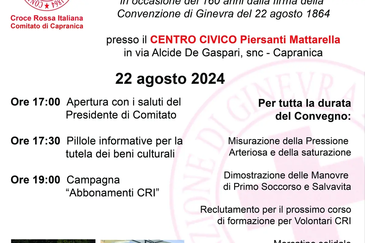 A fare da protagonista sarà il Comitato di Capranica della Croce Rossa Italiana che invita tutta la popolazione a scoprire come in quella data, ci fu la firma della Convenzione di Ginevra del 1864 che ha dato vita al Movimento Internazionale, oggi da tutti conosciuta come Croce Rossa.