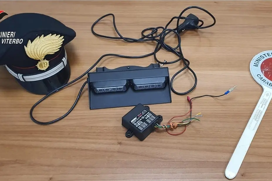 Rimosso il panno scuro, i carabinieri hanno trovato l’istallazione fissa di un lampeggiante a led tipicamente utilizzato dalle forze dell’ordine sulle auto di copertura o in servizio di scorta alle personalità.