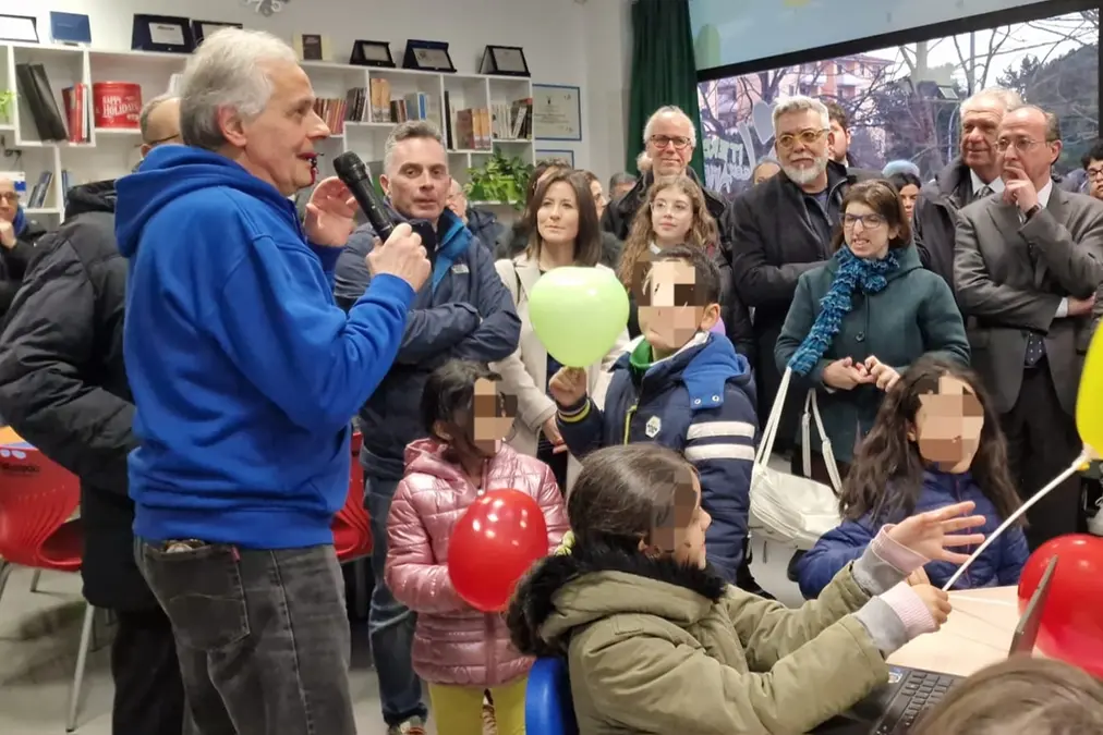 Dentro la sala, tavoli allestiti con varie postazioni di computer, giochi ma soprattutto materiale didattico.
