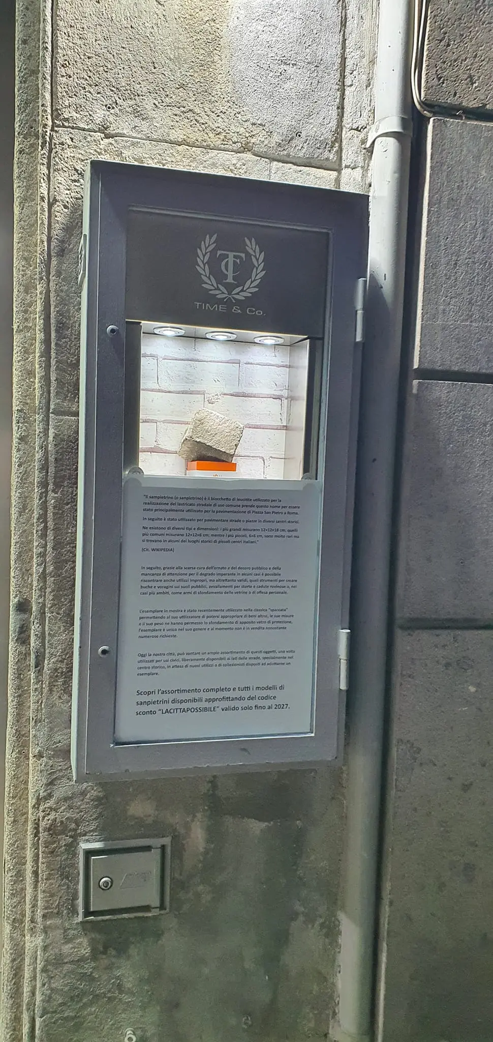 Il sampietrino utilizzato per il furto in una gioielleria del centro finisce in vetrina. La singolare iniziativa è di Marco Morbidelli, il titolare della gioielleria Time & co. Nella vetrina insieme al sampietrino un cartello che spiega l’iniziativa: “Grazie alla scarsa cura dell’ornato e del decoro pubblico e della mancanza di attenzione per il degrado imperante in alcuni casi è possibile riscontrare anche utilizzi impropri, ma altrettanto validi, quali strumenti per creare buche e voragini sui suoli pubblici, avvallamenti per storte e cadute rovinose o, nei casi più ambiti, come armi di sfondamento delle vetrine o di offesa personale. L’esemplare in mostra è stato recentemente utilizzato nella classica ‘spaccata’ permettendo al suo utilizzatore di potersi appropriare di beni altrui, le sue misure e il suo peso ne hanno permesso lo sfondamento di apposito vetro di protezione, l’esemplare è unico nel suo genere e al momento non è in vendita nonostante numerose richieste. Oggi la nostra città, può vantare un ampio assortimento di questi oggetti, una volta utilizzati per usi civici, liberamente disponibili ai lati delle strade, specialmente nel centro storico, in attesa di nuovi utilizzi o di collezionisti disposti ad adottarne un esemplare. Scopri l’assortimento completo e tutti i modelli di sampietrini disponibili – conclude ironico – approfittando del codice sconto “LACITTAPOSSIBILE” valido solo fino al 2027”.