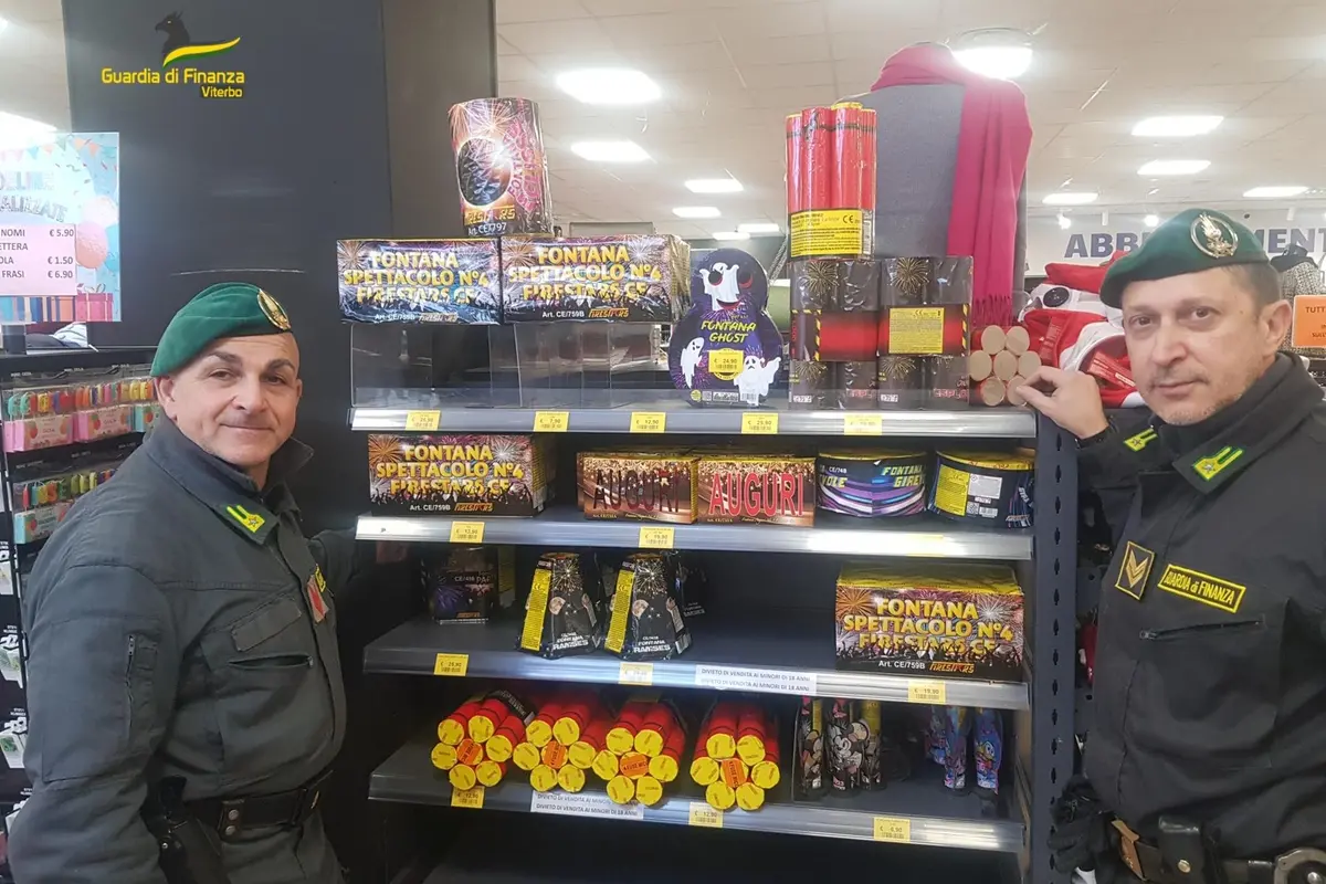 Le fiamme gialle hanno proceduto così al sequestro complessivo di 2.027 confezioni, per un peso lordo di 400 chili circa, contenenti 16.815 artifici pirotecnici appartenenti alle categorie “F1”, “F2”, “P1” e “T1”, e alla segnalazione di un responsabile alla competente autorità giudiziaria. “La brillante operazione eseguita - sottolineano dalla guardia di finanza - testimonia il costante impegno delle fiamme gialle della Tuscia nel contrasto alla vendita di artifizi pirotecnici detenuti in modo illegale, intensificato a seguito di specifiche disposizioni dell’autorità prefettizia in recenti Comitati per l’ordine e la sicurezza pubblica, in occasione delle festività di fine anno”.